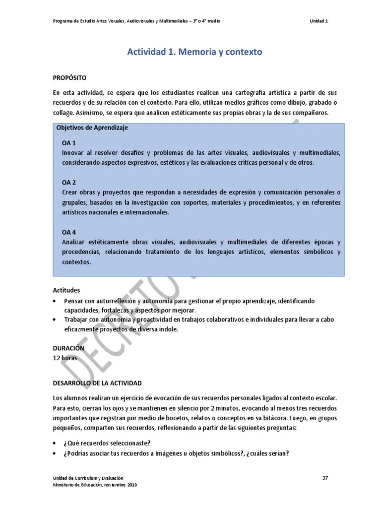 Programa de estudio artes visuales, audiovisuales y multimediales 3° o 4° medio aprobado por decreto exento n°496 del 15 de junio de 2020.. Programa de estudio artes visuales, audiovisuales y multimediales 3° o 4° medio aprobado por decreto exento n°496 del 15 de junio de 2020. Artes visuales, audiovisuales y multimediales, tales como el propósito expresivo, las materialidades, los procedimientos y soportes, el uso del lenguaje visual y audiovisual, y los aspectos estéticos. Equipo de desarrollo curricular unidad de currículum y evaluación ministerio de educación 2021 importante en el presente documento, se utilizan de manera inclusiva términos como "el docente", "el Presentación de la asignatura electiva artística. Me preocupé de buscar los materiales necesarios. Equipo de desarrollo curricular unidad de currículum y evaluación ministerio de educación 2021 importante en el presente documento, se utilizan de manera inclusiva términos como "el docente", "el